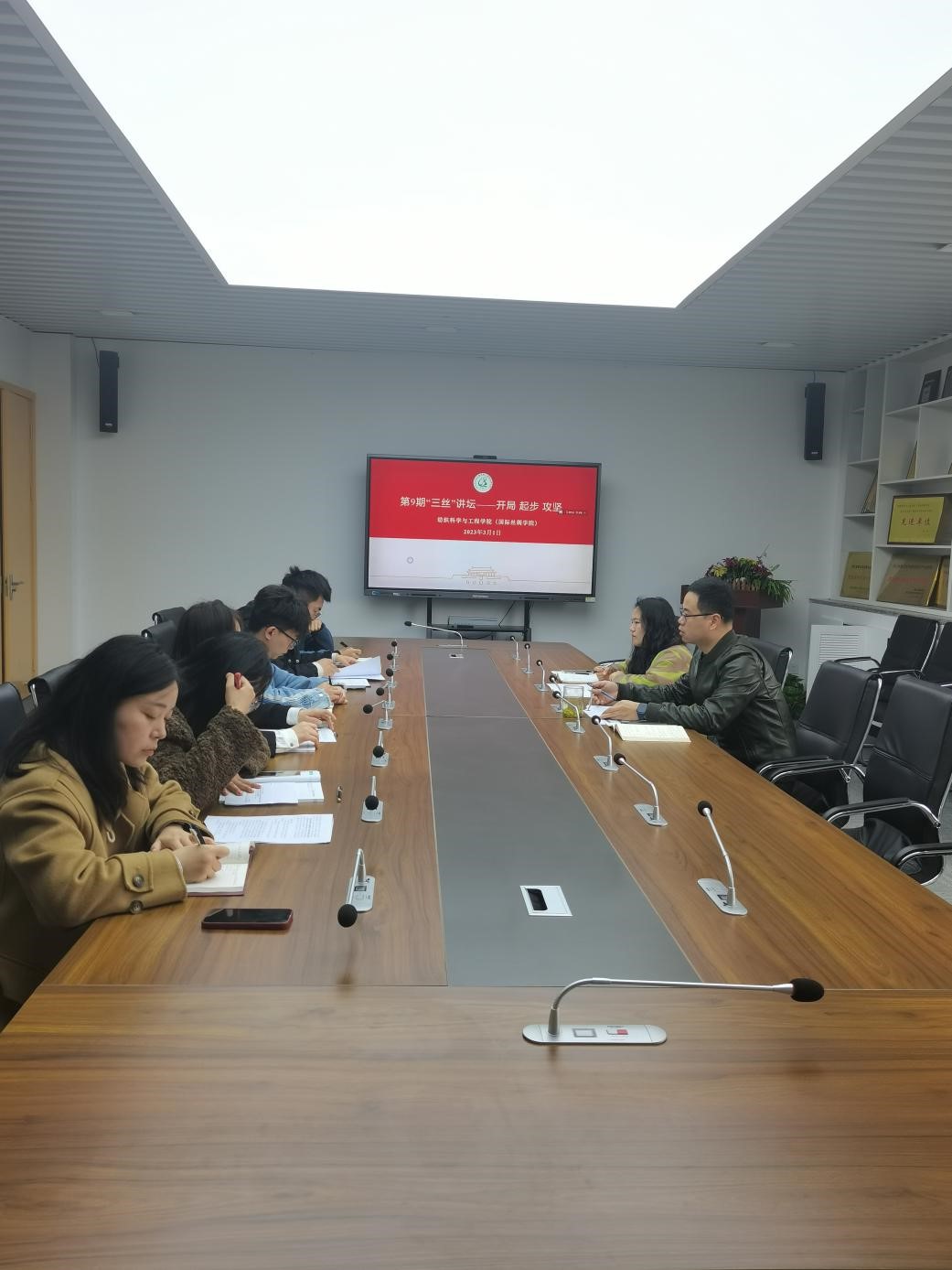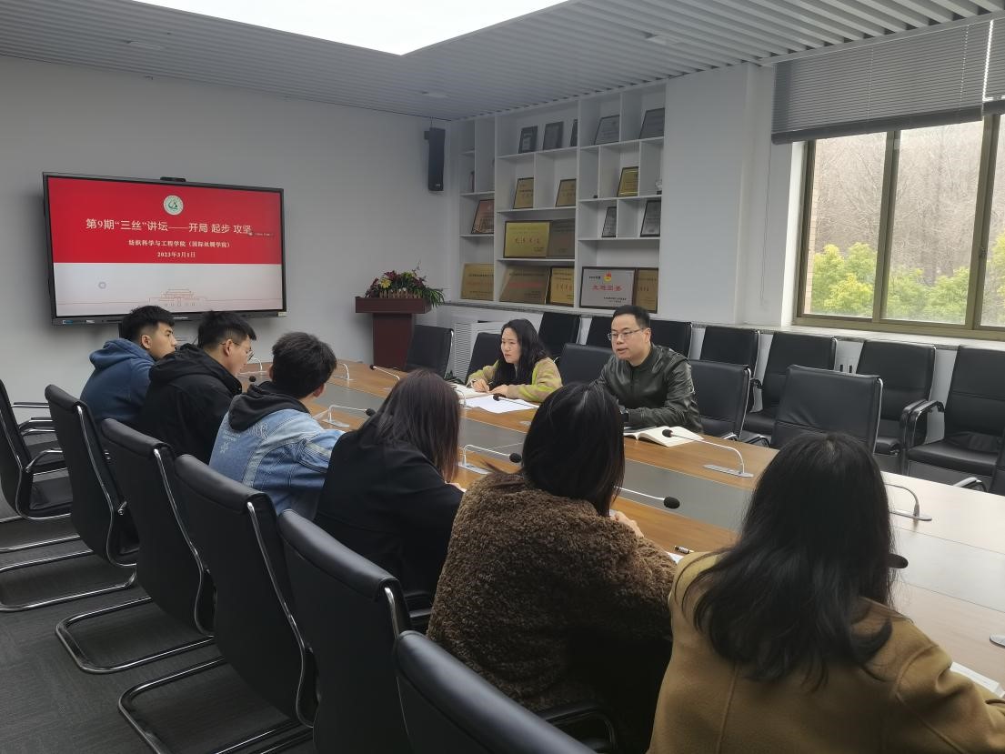 在17-312举行第九期“三丝讲坛”,论坛主题为“开局、起步、攻坚”。参加活动的有学院党委副书记方平以及学生工作办公室全体辅导员。