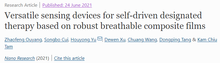 余厚咏特聘教授课题组在国产顶级期刊Nano Research连续发表两篇研究论文。其中《Flexible, anti-damage, and non-contact sensing electronic skin implanted with MWCNT to block public pathogens contact infection》工作是通过与四川大学张新星教授等学者在材料、纺织、信息等学科交叉融合而成,余厚咏特聘教授为通讯作者,博士研究生王端超为第一作者;在《Versatile sensing devices for self-driven designated therapy based on robust breathable composite films》中,余厚咏特聘教授为论文唯一通讯作者,硕士研究生欧阳兆锋为第一作者,上述成果进入“挑战杯国赛”决赛中。