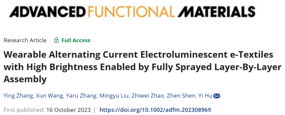 教师胡毅教授团队在可穿戴电致发光(ACEL)显示领域取得新进展,相关工作以 “Wearable Alternating Current Electroluminescent e-Textiles with High Brightness Enabled by Fully Sprayed Layer-by-Layer Assembly” 为题发表在国际顶级学术期刊《Advanced Functional Materials》(IF=19.0)上。浙江理工大学为第一署名单位,麻豆