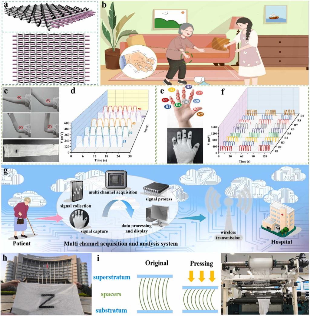 与1D纤维和2D织物相比,首先,3D织物不仅增加了面内方向上纤维排列的层数,而且还在厚度方向上引入了纤维,增加了结构完整性和尺寸稳定性;其次,3D织物结构可以实现纤维之间从点到线再到表面的渐进接触响应,提高压力传感的灵敏度和响应速度。最后,3D织物具有自由弯曲和折叠的能力,织物基PCR-TENG可以更贴合实际中的弯曲变形。因此,受这些纺织技术的启发,本研究实现了织物基TENG的大规模生产,用于多种场景下的传感和供电。