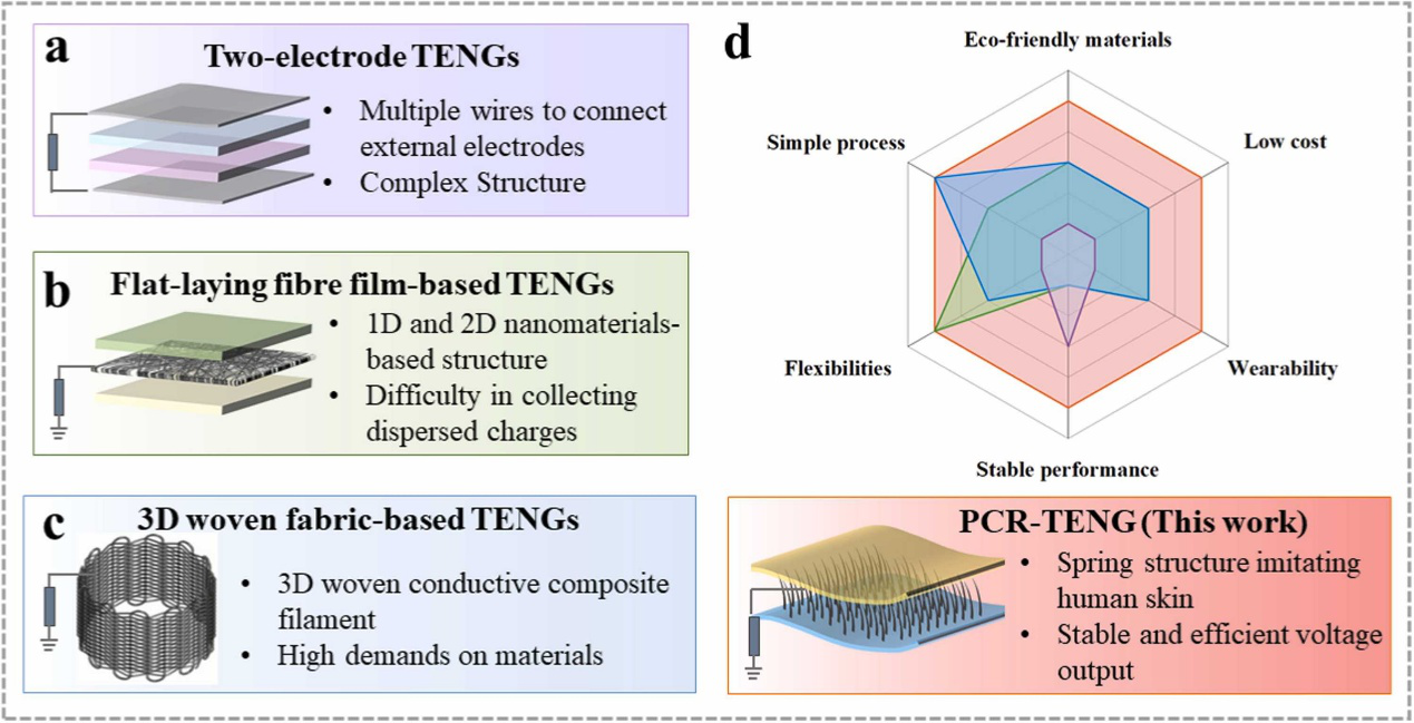 图1. 双电极TENG、平铺纤维膜基TENG和3D织物基TENG、PCR-TENG的原理图与性能对比雷达图。
