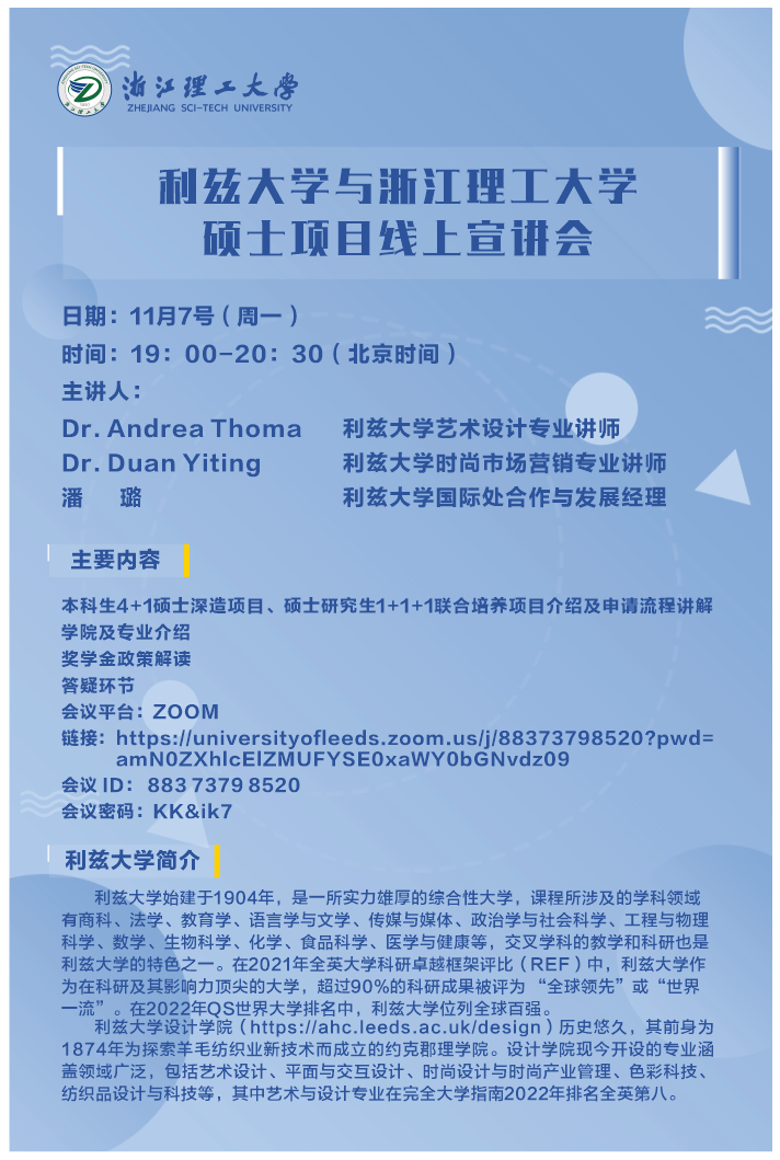 学生赴英国利兹大学设计学院攻读4+1合作项目、双硕士学位合作项目的工作已经开始。为做好此项工作,拟定线上举办线上宣讲活动,具体预告如下: