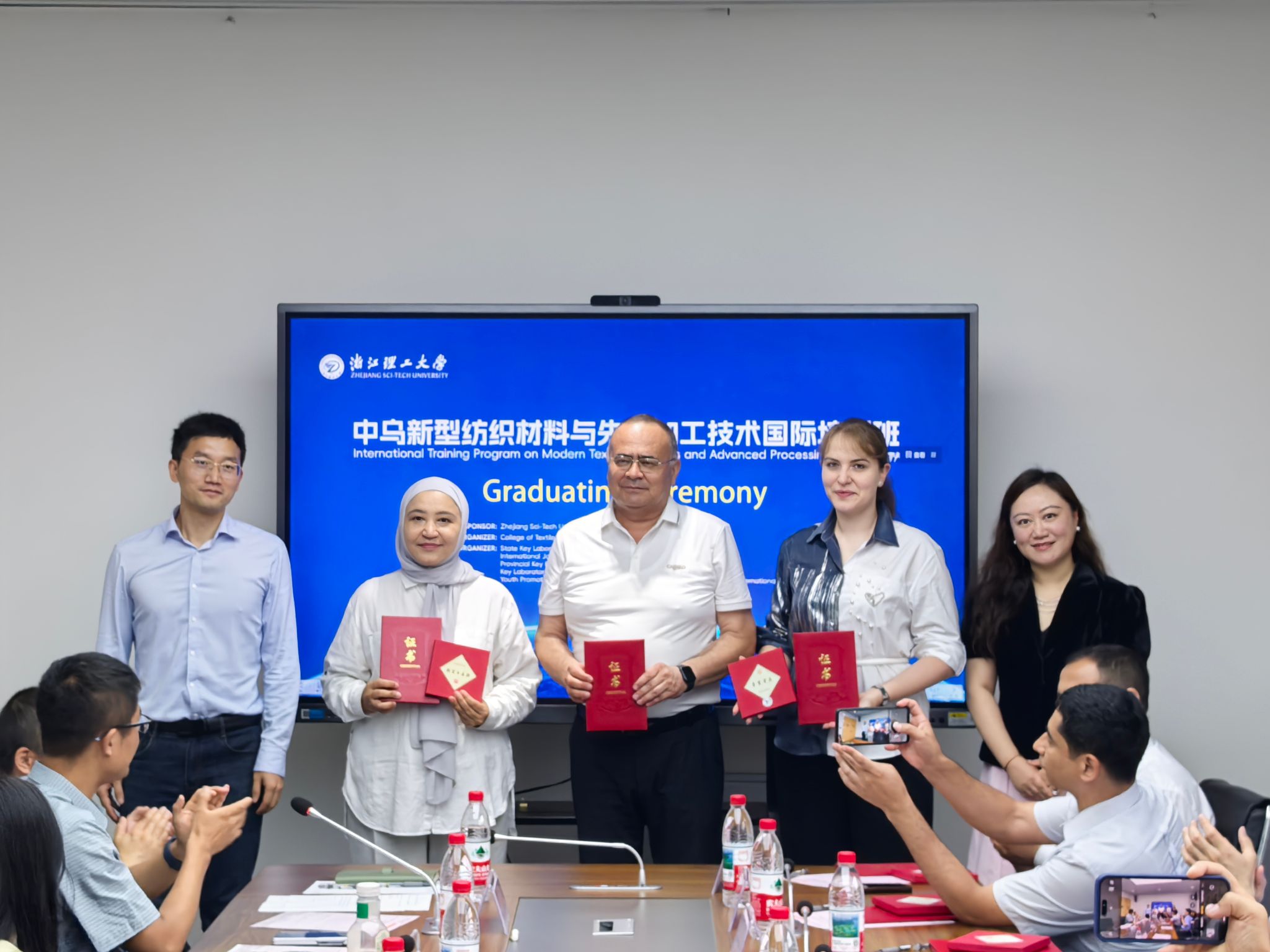 本次培训班共有来自乌兹别克斯坦塔什干纺织与轻工业学院15名学员参加。培训内容围绕新型纺织材料与先进加工技术为主题,采取课堂教学和生产现场调研相结合的授课方式,就丝绸文化、缫丝织绸、先进纺织、产品设计与后整理等内容展开,开设了一系列全英文授课课程。培训期间,组织学员走访参观了浙江省现代纺织技术创新中心、浙江东进新材料有限公司、万事利集团等纺织相关企事业单位及中国丝绸博物馆。本次培训班为期15天。