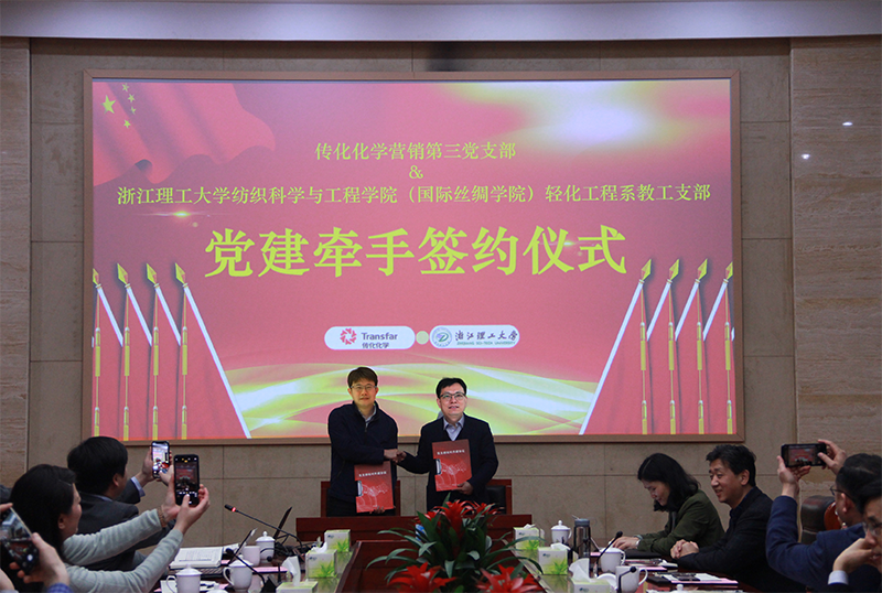轻化工程系教工支部与传化化学集团营销第三党支部在“纺化技术创新与应用研究院” 第三期合作课题开题之际,举行支部结对的党建牵手仪式,将双方的合作广度和深度推向更高水平。校企两方支部书记就课题研究、参访学习、人才培养等各方面的合作进行了细致的探讨和深入的交流。轻化工程系教工支部书记胡毅针对传化积极响应国家强化科技创新体系构建能力的号召、促成双方资源共享、优势互补、强化基层党支部建设所做的努力表达赞赏和感谢。传化化学集团营销第三党支部书记金泽表示企业十分重视产学研合作的优良传统,希望能通过此次双方党支部的牵手共建,将党支部的堡垒作用和党员的旗帜作用在双方的课题合作中淋漓尽致得展现出来,为技术与市场的深度融合创建更广阔的平台。在党建牵手签约仪式之后,传化化学集团课题负责人与学院教师针对课题合作中所提到的研究思路和研究方法等进行了深入的讨论和分析,并结合染厂实例剖析实践应用的便捷性。在互换意见的过程中,双方进一步明晰了课题的研究思路、明确了研究方向和研究方法,为课题的顺利开展奠定了基础。今后双方支部会进一步加强互访交流,增加合作维度,为之后开展更深层次的校企合作做好积累。