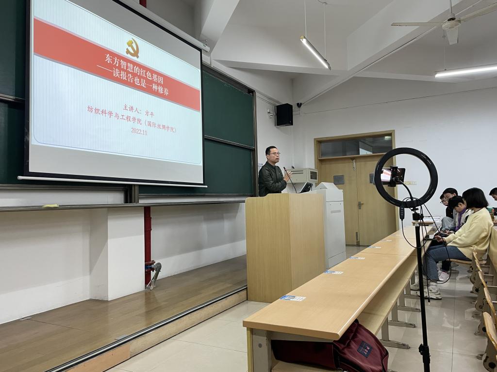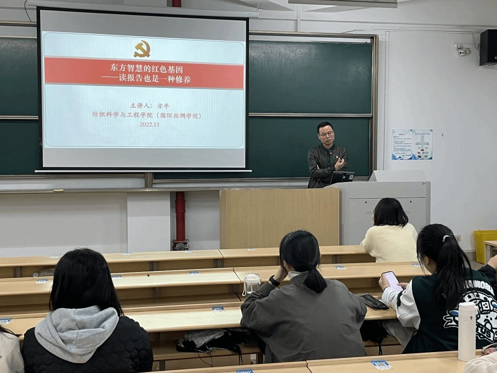 课上,方平以“读报告也是一种修养”为主题,运用中华优秀传统文化的思辨视角,激发大家在读党的二十大报告时,更有深度地理解、认知、感悟中华优秀传统文化的思维养成。他从“两个结合”的理论和现实逻辑出发,运用分解逻辑的授课内容、风趣平实的授课语言、联系实际的身边案例,系统阐述了坚持和发展马克思主义必须同中华优秀传统文化相结合的现实意义。他在课堂中提到,聚焦于东方智慧精髓中的“唯物辩证”要素,寓意青年一代要以守正创新的方式、一以贯之的行动投身于中国式现代化建设,特别要能从“利他主义”、“不使可欲”、“德治为上”、“见利思义”的精神要义中,懂得厚植于中国共产党“全心全意为人民服务”宗旨的红色基因和文化自信。最后,方平鼓励在在座的青年学生要“照镜子、正衣冠、洗洗澡、治治病”,不忘入党初心,切忌松懈怠惰,并从“德性”、“血性”、“定性”三方面提升自身政治修养,立志做有理想、敢担当、能吃苦、肯奋斗的新时代好青年,让青春在全面建设社会主义现代化国家的火热实践中绽放绚丽之花。